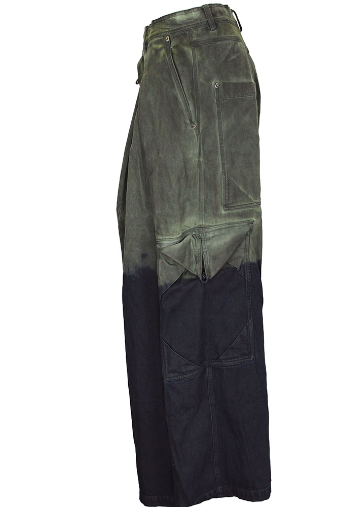 Rundholz Dip Collection over-dyed, low drop-crotch, very wide legged, cargo style, pleated trousers in pine medium colour way. Waistband with belt loops and single button fastening, with internal button reinforcer. long zip fly with covering placket and fabric pull. Box pleated on each leg. 2 side pockets with rivet reinforcing. 2 rear patch pockets, with finishing trim and rivet reinforcing and triangular insets at each lower corner. 2 rear side pockets, with triangular folded flap and button fastening, triangular insets open on the inside at each corner. Finished hems.