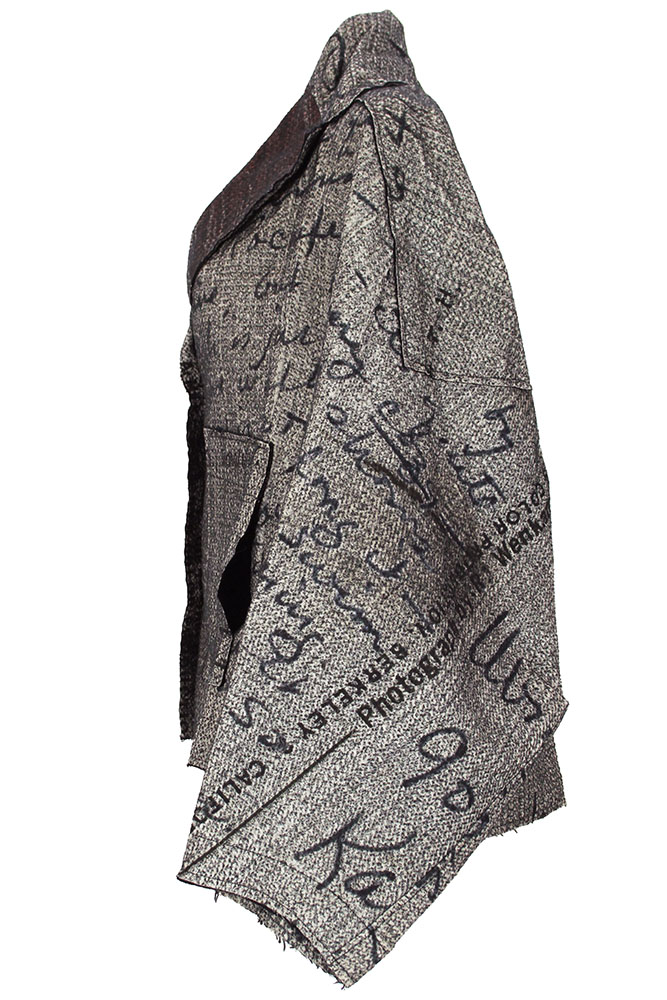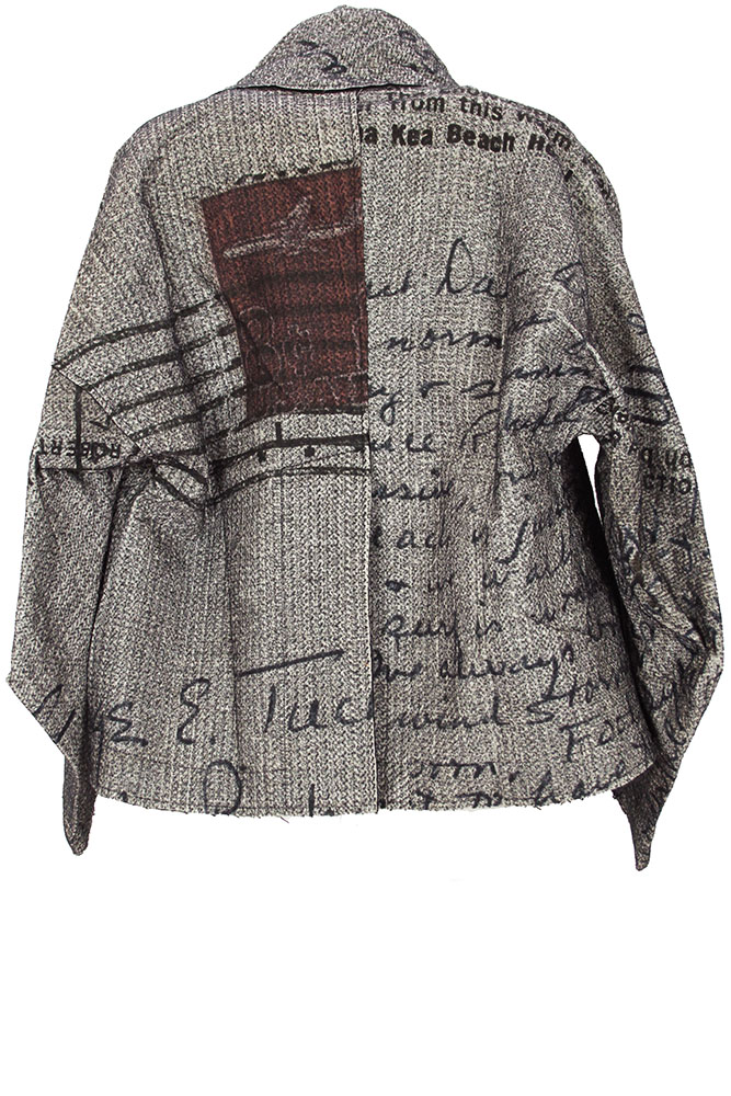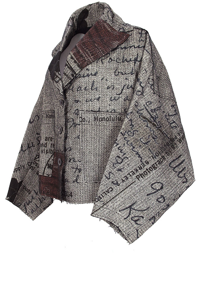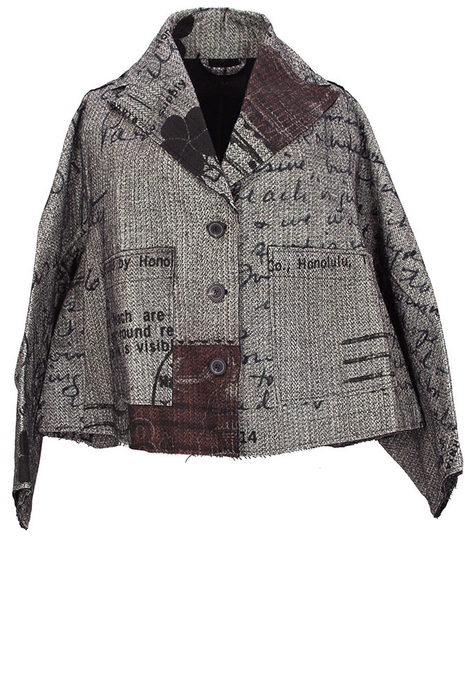 Rundholz Dip Collection short, wide jacket in backside print colour way. 3 button fastening. Large notched lapel collar. Raw edging on all edges, with stitch finish. 2 large, side entry patch pockets with raw edging and stitch details. Very wide, angled, shaped arms, tapering to double layered, raw edged cuff panels. Longer at the rear with a central vent.