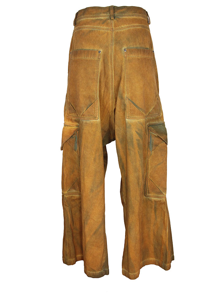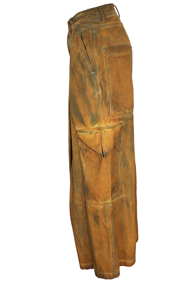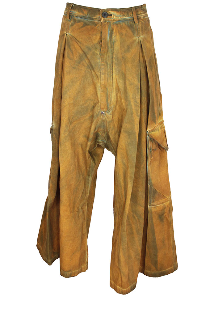 Rundholz Dip Collection over-dyed, low drop-crotch, very wide legged, cargo style, box pleated trousers in Lagoon Light colour way. Waistband with belt loops and single button fastening, with internal button reinforcer. long zip fly with covering placket and fabric pull. Box pleated on each leg. 2 side pockets with rivet reinforcing. 2 rear patch pockets, with finishing trim and rivet reinforcing and triangular insets at each lower corner. 2 rear side pockets, with triangular folded flap and button fastening, triangular insets open on the inside at each corner. Finished hems.
