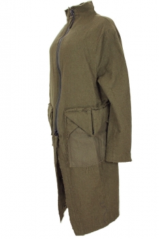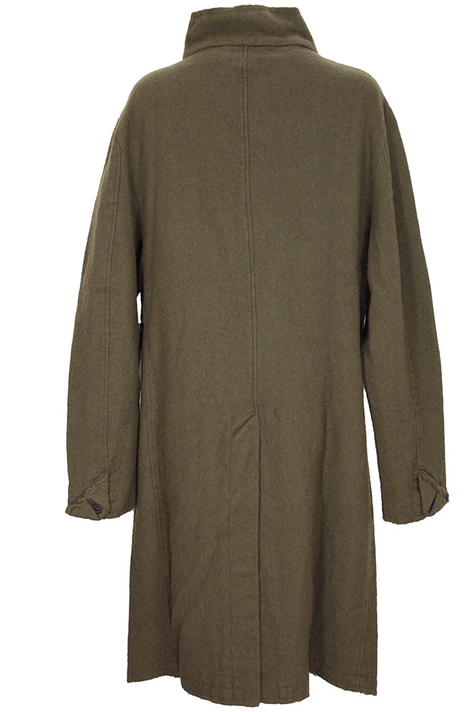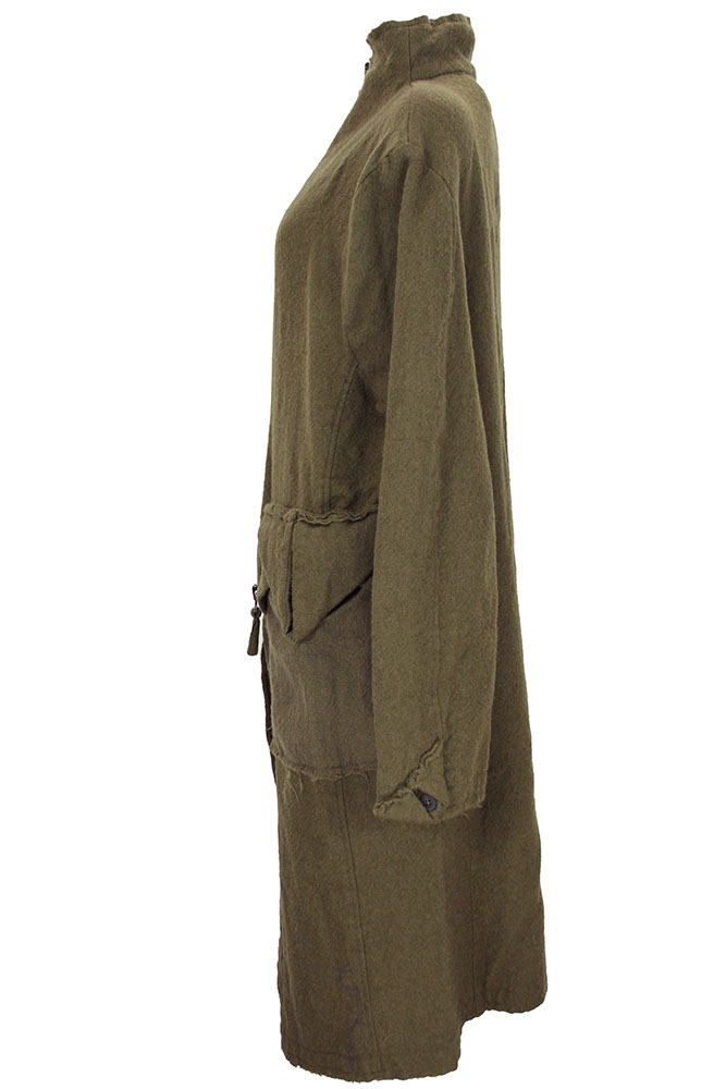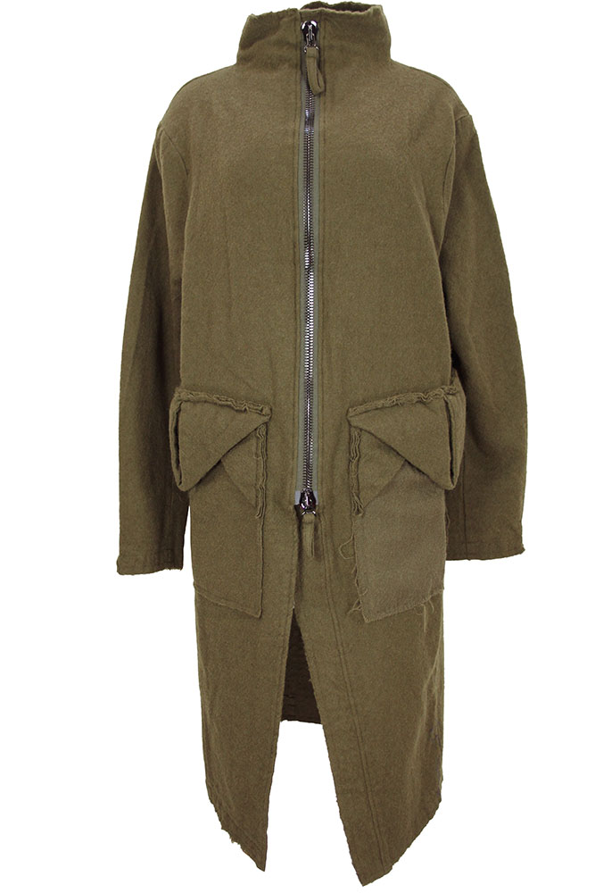 Rundholz Dip Collection over-dyed, wool coat in Light Pine colour (khaki green). Raised, round, double layered collar, with raw edged finish. Large, long, double zip fastening down the front, with fabric pulls. 2 very large patch pockets with triangular, folded fabric flaps and button fastenings, raw edge seams. Cuffs are single button fastening with triangular, folded fabric tabs, double layered cuff panels and raw edge detail. Hem panels are double layered with raw edging and stitch detail. Long central flap at rear.