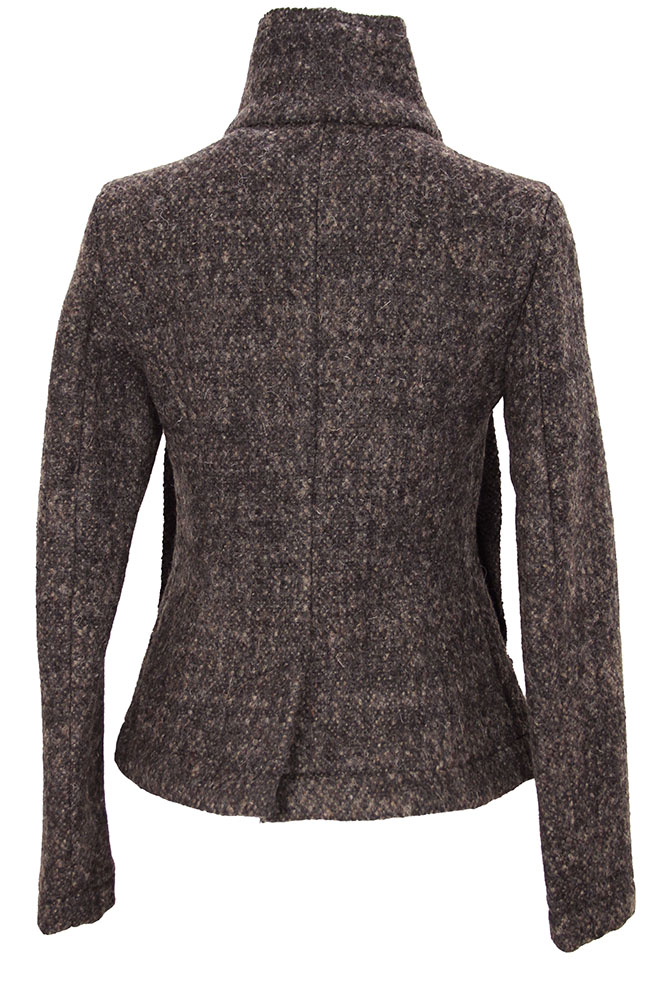 Rundholz Mainline Collection Short, heavy wool zip jacket in turf mel colour. Double layered raised round neck, with raw edge and stitch finish. Large, double zip fastening down the front, with fabric pulls and double layered covering placket. 2 long, side entry patch pockets. Turned, double layer cuff panels. Turned, finished hems. Short central vent at rear. All seams inside are taped. The fabric is a beautiful heavy weight marl. Great Winter, smart, short fitted jacket