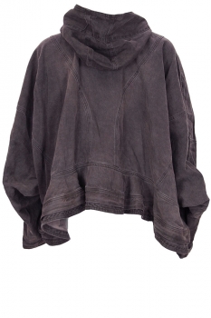 Rundholz Mainline Collection Short, Hooded jacket with flare body and button fastening in Turf wash colour. Hood with double layer trim. 6 button fastening down the front. Bat wing style arms, extending from the flaring body section. 2 button cuffs on double layer cuff panel. 2 pockets with shaped flaps. Double layer peplum, with under layer extending below the outer layer. Very wide body for a beautiful drape. Shaped and curving seams.