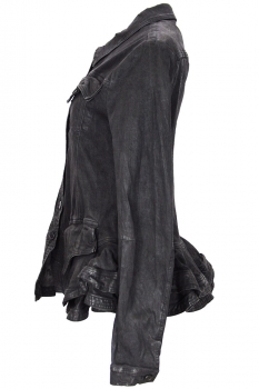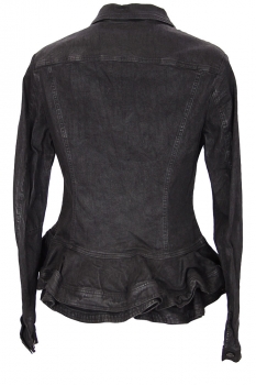 Rundholz Mainline Collection over-dyed and distressed, 4 pocket jacket in black gloss colour. Small collar. 6 button fastening down the front. 2 chest pockets with elaborate shaped flaps and 2 main pockets with the same. Double peplum style with lower layer extending from behind the front layer. Double layer cuff panels with 2 button fastenings. Curved seams and with a beautiful flare out.