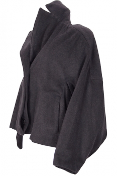 Rundholz Mainline Collection short jacket in wool mix, turf colour. Very wide to give a beautiful drape. Very large collar with notched lapels. 3 button fastening thew 2 lower button covered by placket. 2 side pockets. Wide, articulated sleeves with rolled cuffs. All inner seams are taped. A great jacket in a warm and very cosy fabric. Size Small but will fit small and medium