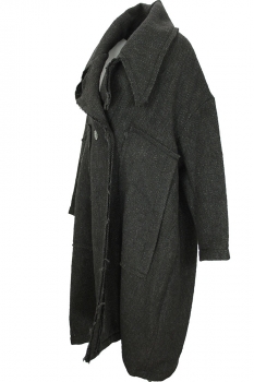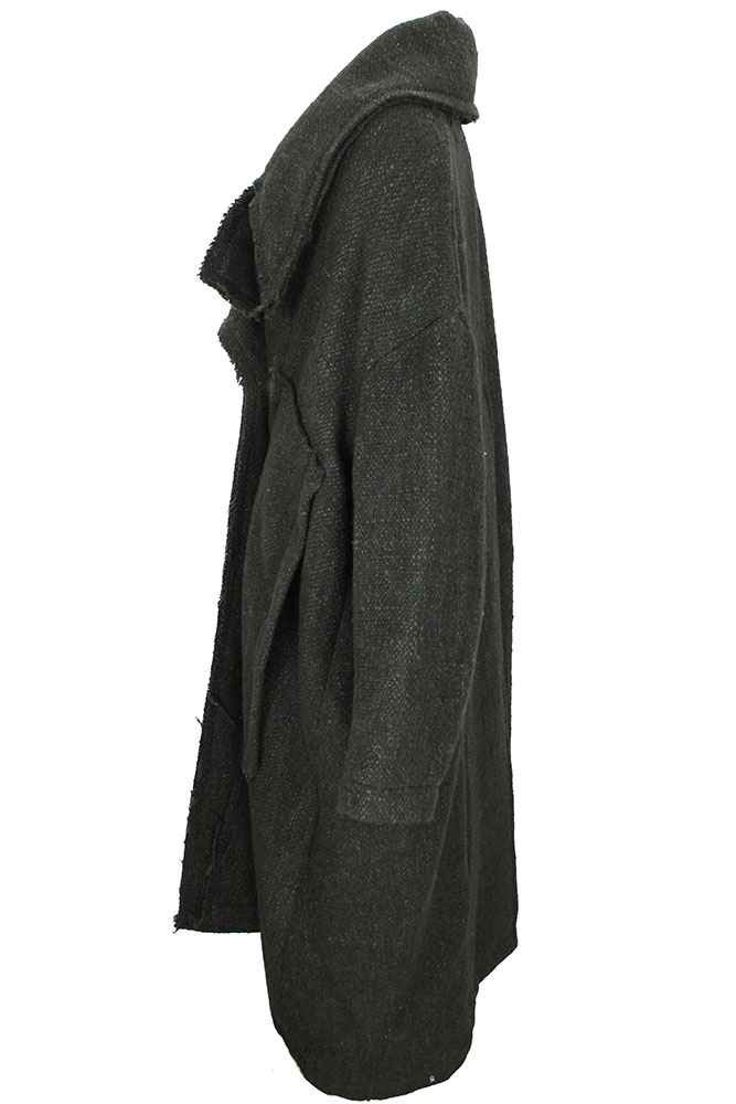Rundholz Mainline Collection Long double-breasted, coat in heavy weave wool mix, black mel colour. Extra large double layered collar with pointed notched lapels. 2 columns of 1 button each fastenings. Very large side entry patch pockets. Raw edging throughout. Turned and stitched cuffs. Long diagonal vent at rear. Finished hems. Although sized small this will fit a few sizes.