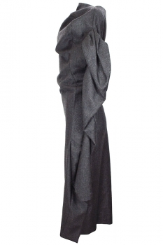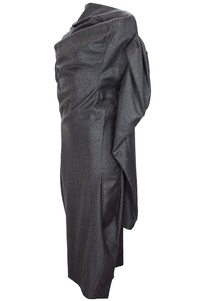 Rundholz Mainline Collection Full Length, Long Sleeved, Superbo Dress in Charcoal Metallic Brushed Wool. Slash neck with double layered panel. Puffed shoulders. Very long sleeves to allow them to be ruched. Tapering in at the hem with side vents. The fabric is charcoal with metallic sparkle.