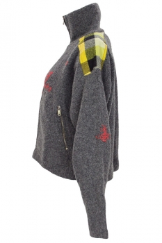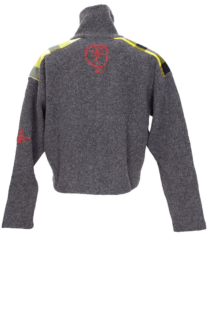 Vivienne Westwood Logo Zip-Up Cardigan in grey knit with check shoulders and cat design on chest in red and embroidered logo on left sleeve. Double layered soft high neck. Full length double zip down the front. 2 angled zip pockets.