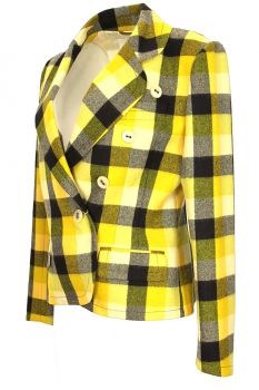 Vivienne Westwood Georgia, double-breasted Jacket in Lochcarron Pixel Check Checked Wool. 2 fastening buttons, 1 inside 1 outside and 3 decorative buttons. All buttons are large mother of pearl style with dark stitching. Large rounded collar with rounded notches. 2 small pockets with flaps and finished trim. 2 button working cuffs with scalloped design fabric edges. Small central vent at rear. Fully lined in orb fabric.