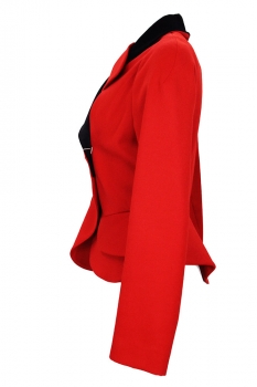 Vivienne Westwood Stormy, double-breasted Jacket in red worsted wool with black velvet collar. Asymmetric collar, the left side with overlapping notch. 3 button fastening and single button inside, metal roman coin style buttons. Asymmetric peplum which extends around the side to the front providing the flaps for the small pockets. Plain cuffs. Dart detail. Longer on the right side. Fully lined in orb design fabric.