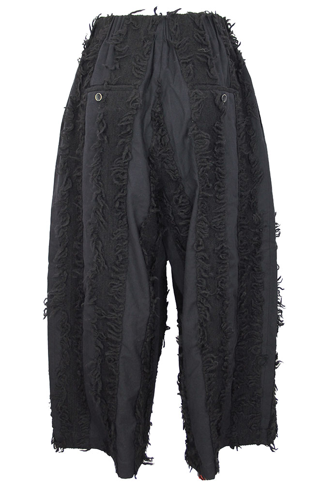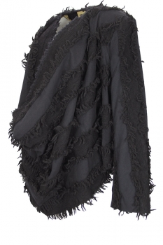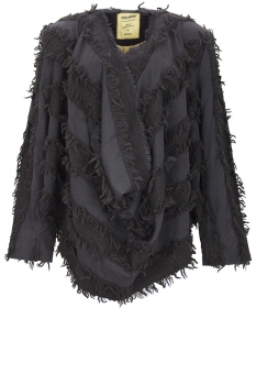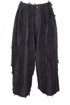 Uma Wang 2 piece, Kinoa Jacket and Poetic Trouser suit in black with fringing. Long sleeved top with padded shoulders and open draped neckline. The neckline has a black fringe and there is black fringing throughout. 4 button working cuffs. Fully lined in distressed striped cotton. The trousers have a deep, elasticated gathered waist, with single button fastening. 2 side pockets and 2 rear pockets with button fastenings. Very wide legged. Black fringes throughout both pieces. A beautiful drape over the trousers.
