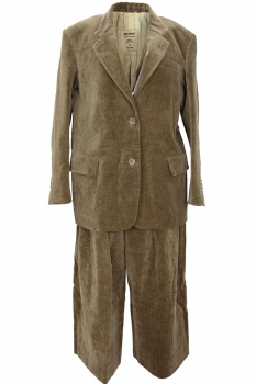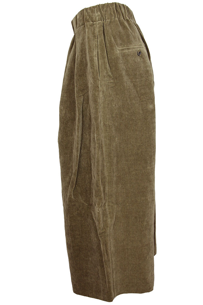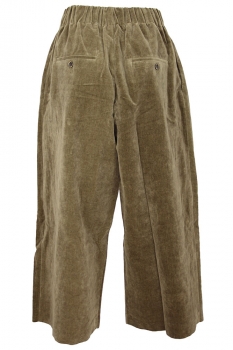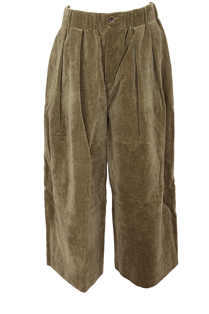 Uma Wang double pleat Poetic Trouser in cotton/linen velvet fabric, light mustard colour. Deep, elasticated, gathered waistband, with single button fastening. 3 button fly with covering placket. 2 side pockets and 2 rear pockets with trim and button fastening. Very wide legs that drape beautifully with the pleats. This trouser matches the Kava Jacket in the same fabric creating a stunning suit!!