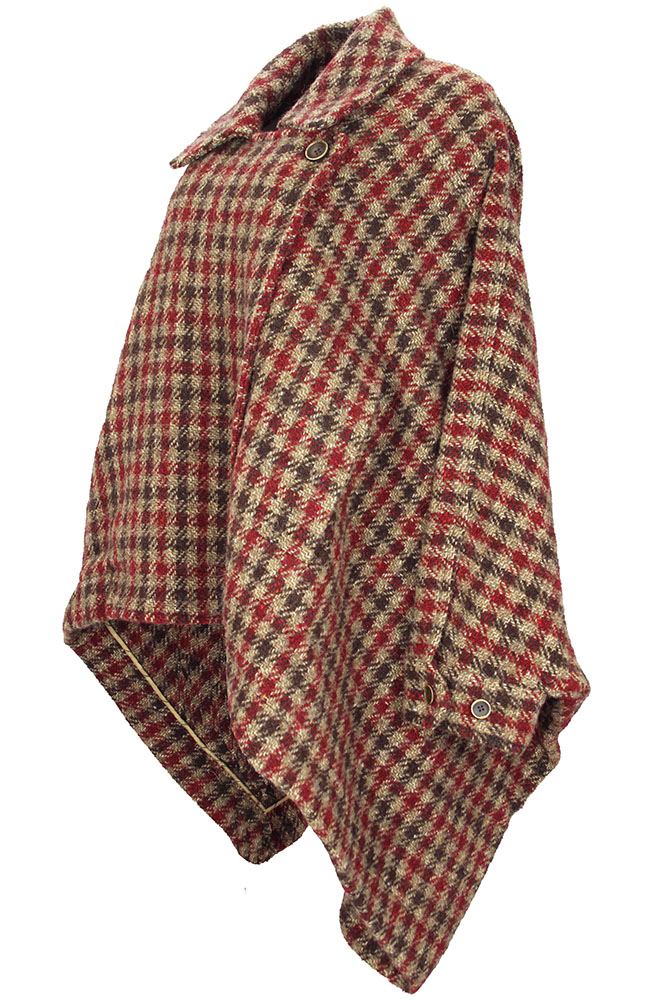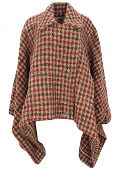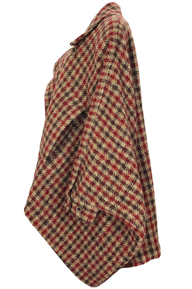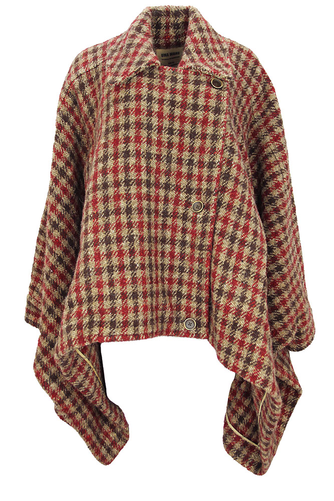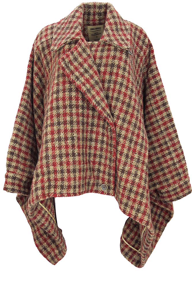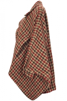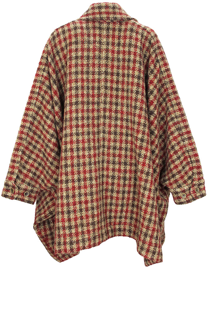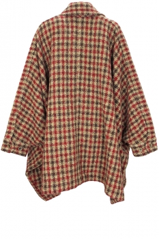 Uma Wang over-sized, mustard and red check, double-breasted kew jacket in wool mix. 3 buttons on the outside and one button on the inside. Large collar. Bat wing style with 2 button cuffs with fabric tab buttonholes. Extra large pockets with panel trim. Hem with adjustable fabric pulls and button fastenings. A brilliant, warm jacket that can be worn in many ways. Sized small but will easily fit a medium and large.