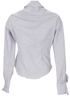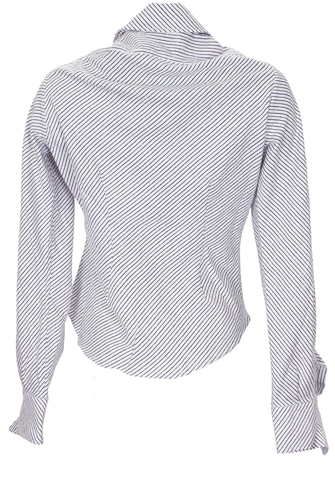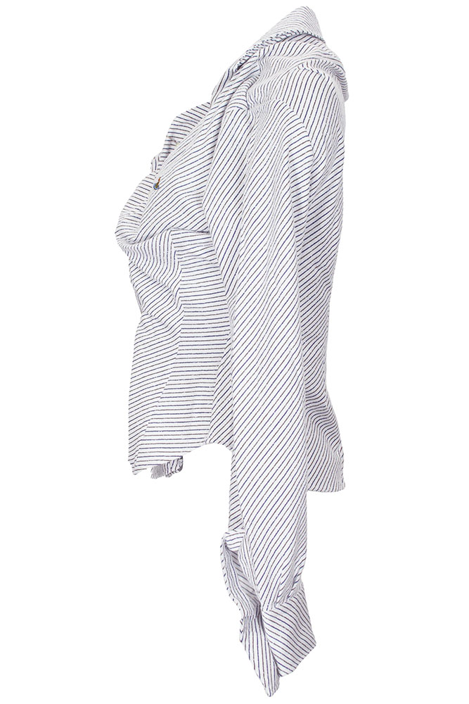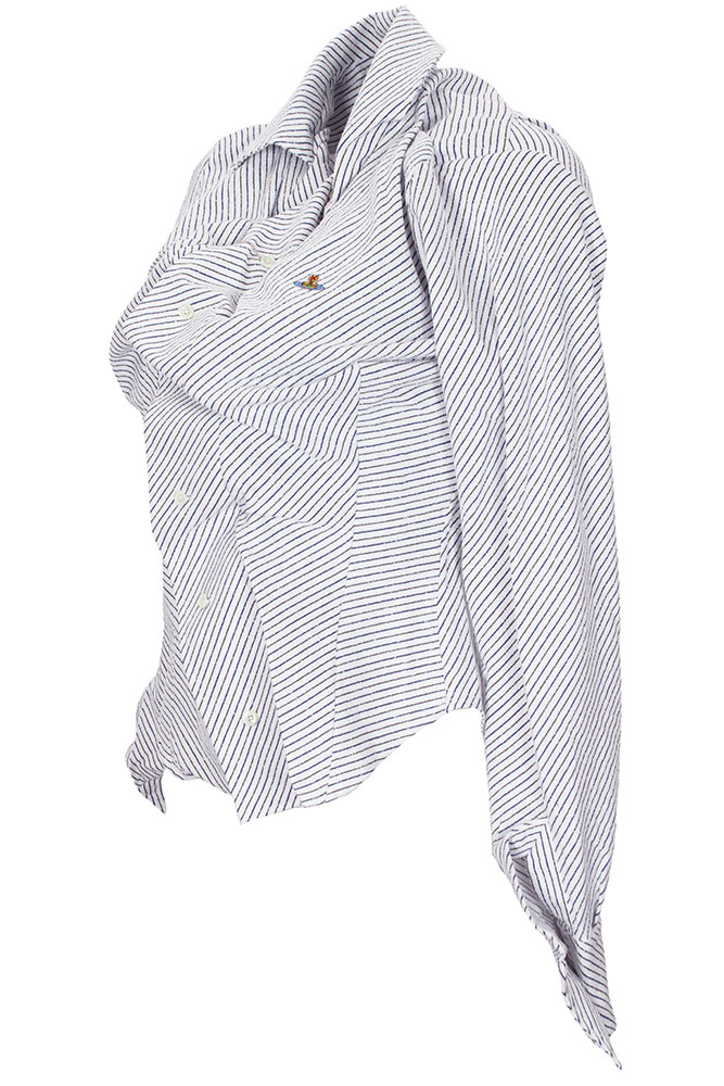 Vivienne Westwood Long sleeved Drunken Shirt in blue/brown striped boucle shirting white fabric. Asymmetric collar. 6 button fastening on curved front. Folded fabric detail. Essentially the classic drunken shirt in a fitted design with long-sleeves. Folded fabric cuffs, with pointed design and single button fastening. Embroidered orb on left chest.