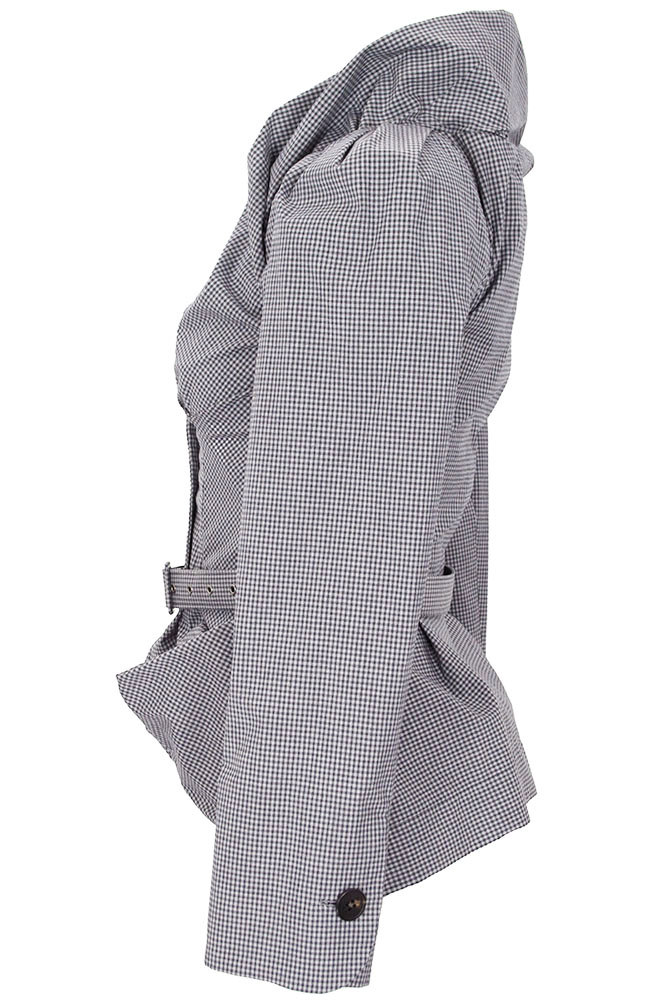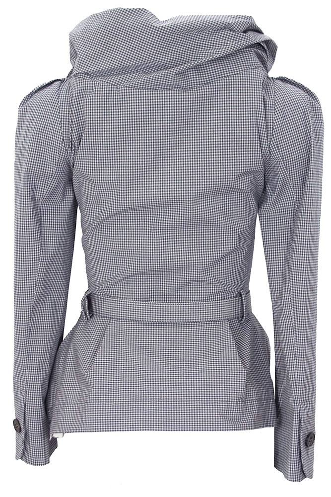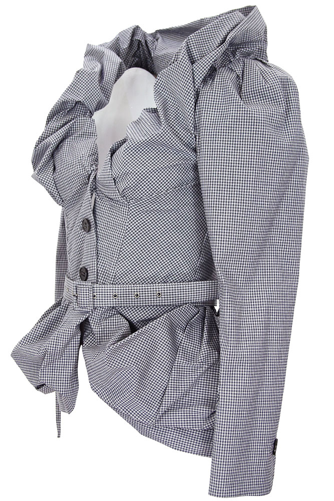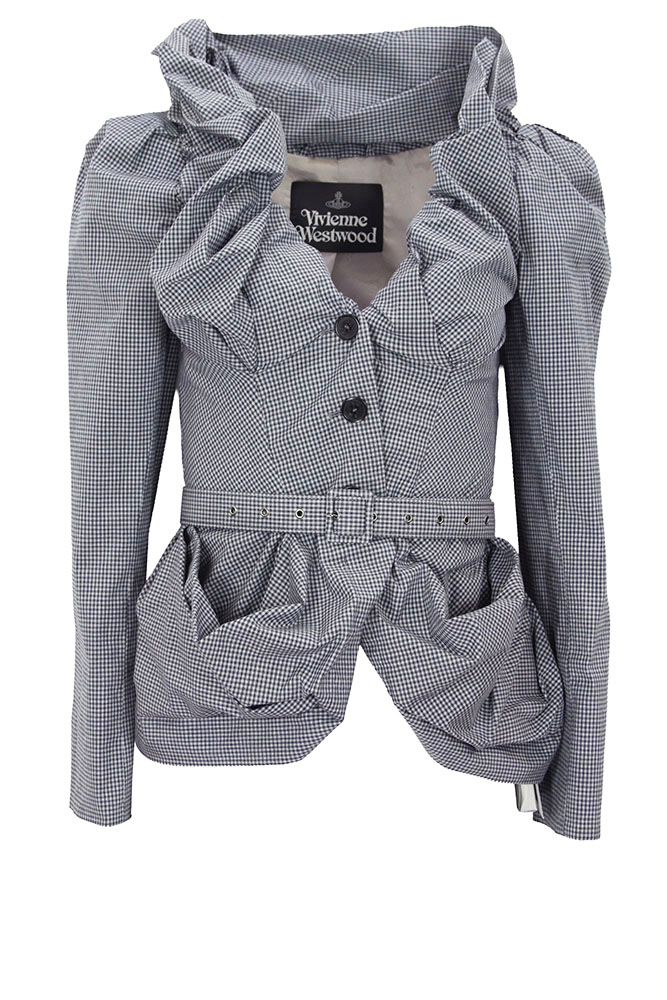 Vivienne Westwood Kendall Jacket in blue/grey gingham English Co Tailoring, with belt. Elaborate, double layered and folded fabric collar. 3 button fastening. Peplum style. 2 folded fabric pockets. Rounded cuffs with single button fastening. Fully lined in orb embroidered fabric. There are belt loops for the belt. The belt is reinforced fabric, with metal holes and fabric covered metal buckle. Looks great with or without belt.