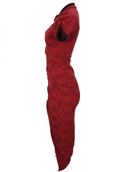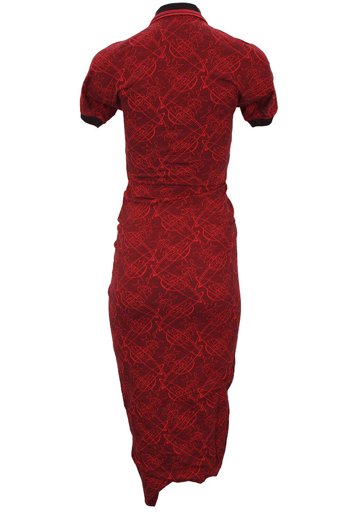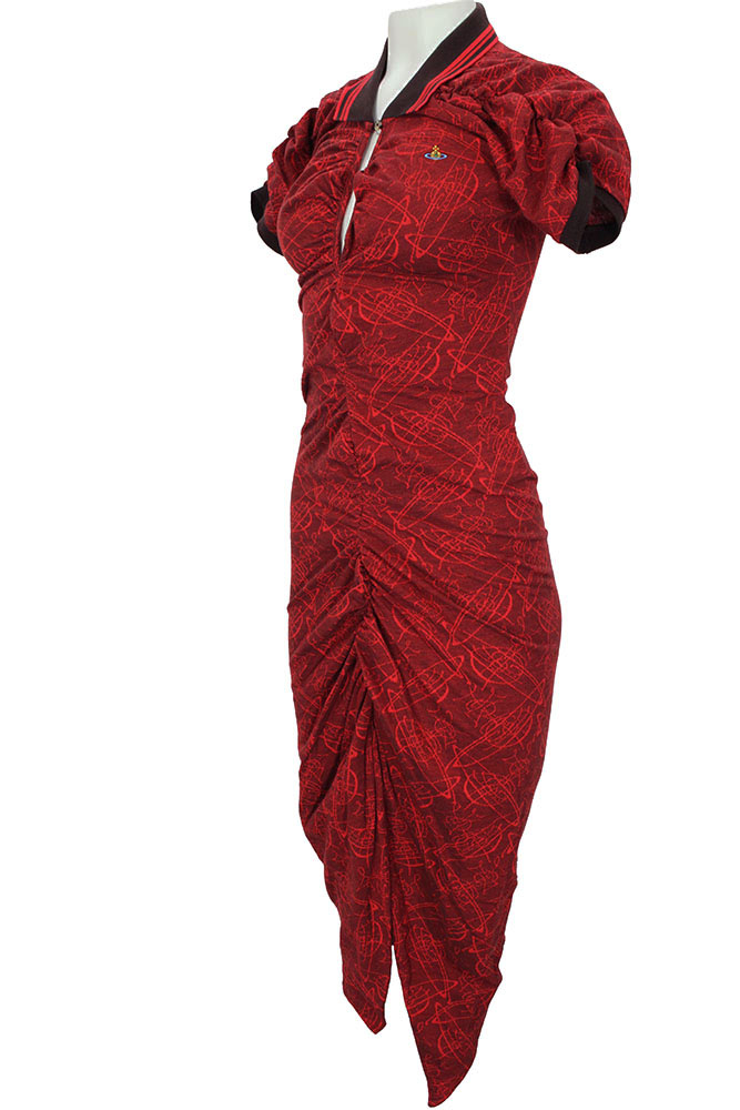 Vivienne Westwood Short Sleeved, Pulling Dress in Graffiti Orbs Jacquard Piquet organic cotton. Small ribbed collar in dark mauve with red stripes and single button fastening. Below the button the opening is ruched at each side with finished trim, the ruching continues right down to the front hem. The shoulders, extending into the sleeves are elasticated at the top, creating a ruched/gathered effect. The short sleeves are finished in dark mauve ribbed trim. Very fitted with elaborate folded fabric detail at the hem and folded up into the garment at the hem to create additional weight. A classic Westwood dress in a gorgeous fabric..