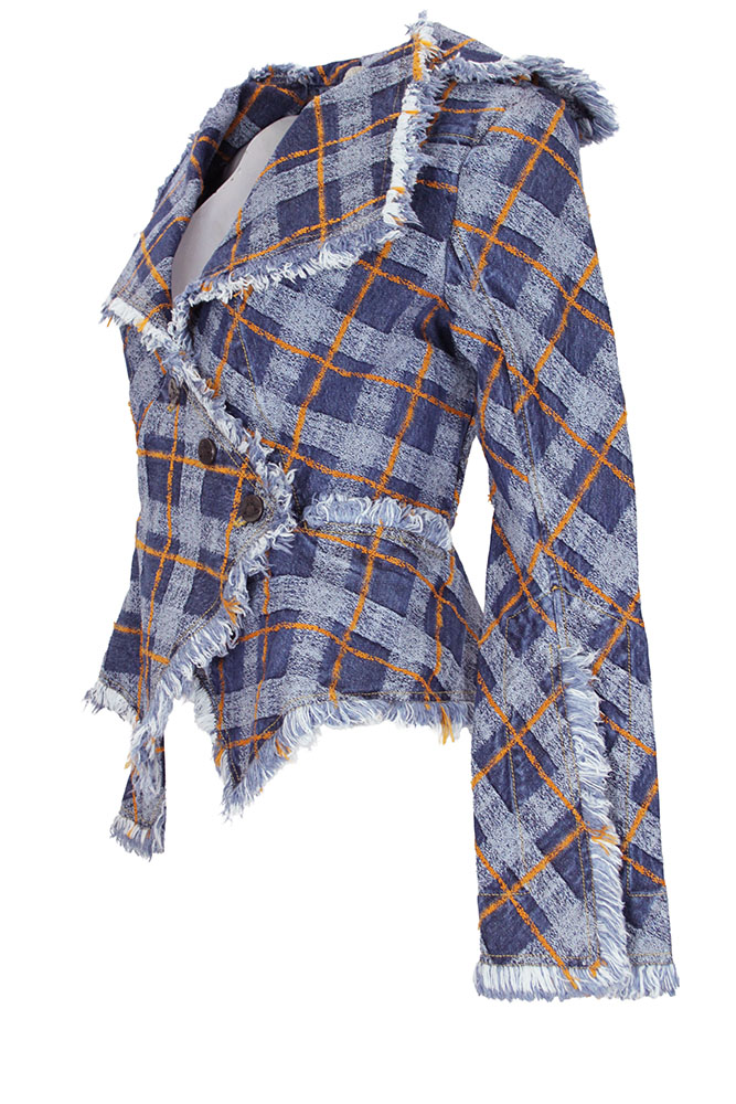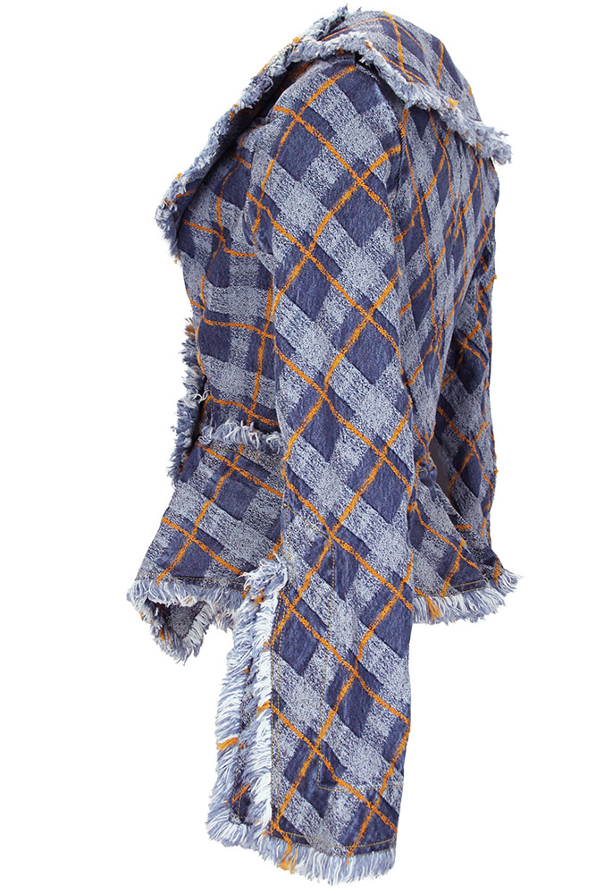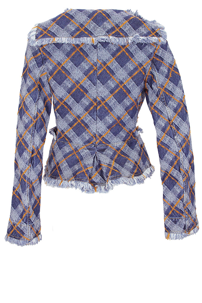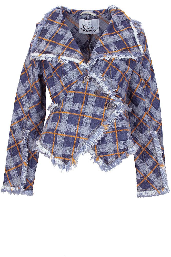 Vivienne Westwood Worth More jacket in blue/orange denim tartan fabric. Extra large collar and lapels with fringe edging. Cross-over fastening with 3 metal rivet buttons on the diagonal. 2 pockets with fringe trim. Long sleeves with long open cuffs, with fringing. Another classic style Westwood jacket in an amazing denim tartan. Beautifully shaped and tailored.
