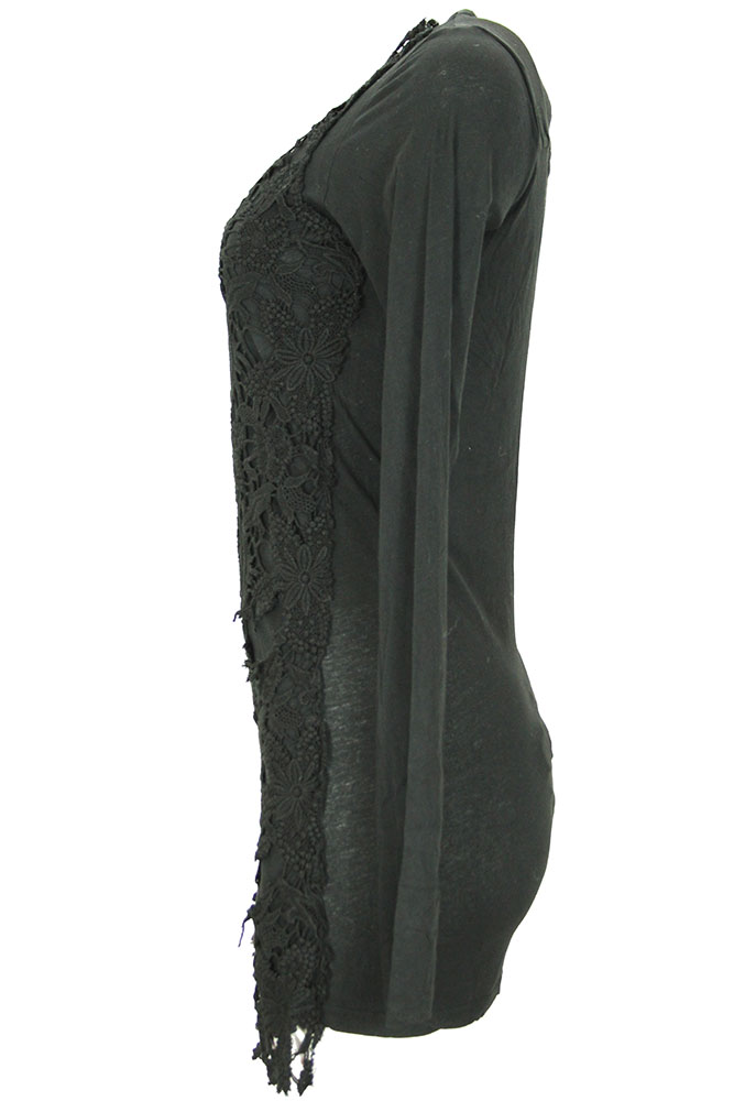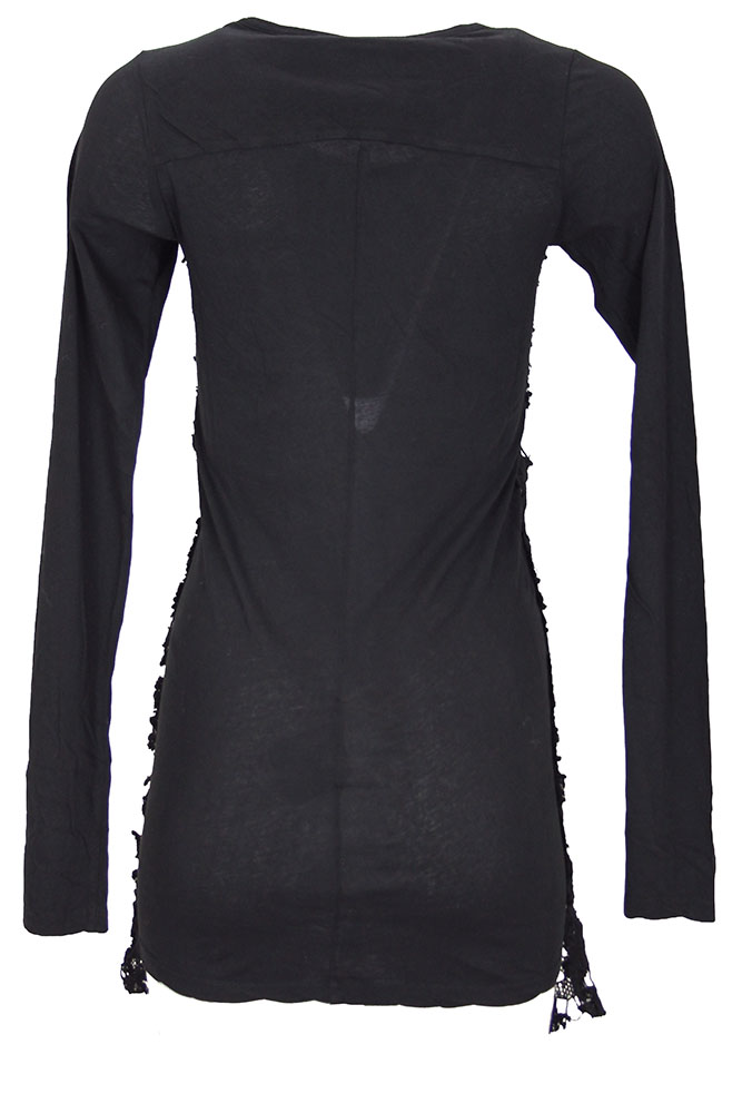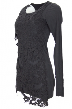 Rundholz Dip Collection long, long sleeved top with lace front in black gloss colour. Round neck with lace extending to the top of each shoulder. Plain black sleeves and rear.