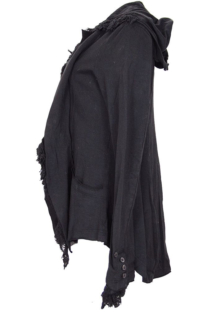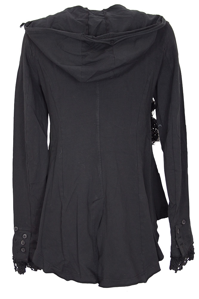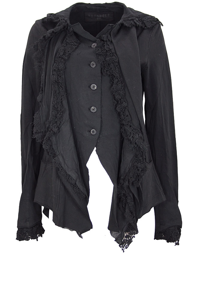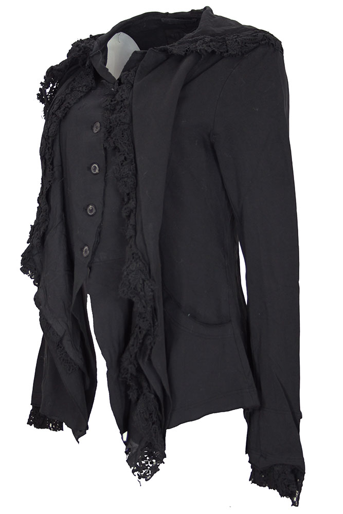 Rundholz Dip Collection hooded jacket with lace decoration in black gloss colour. Double layered hood with raw edging. 5 button fastening. Lace embellished flaps on each side at the front. 2 curved pockets with raw edged trim. Curved raw edged hem. 4 button cuffs with lace detail. Central vent at the rear. A beautiful piece of clothing.