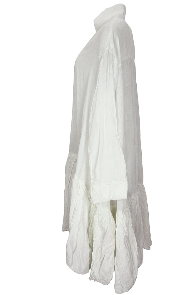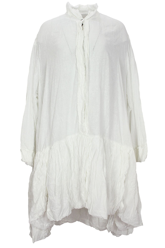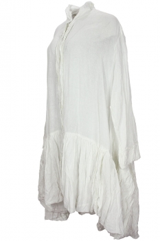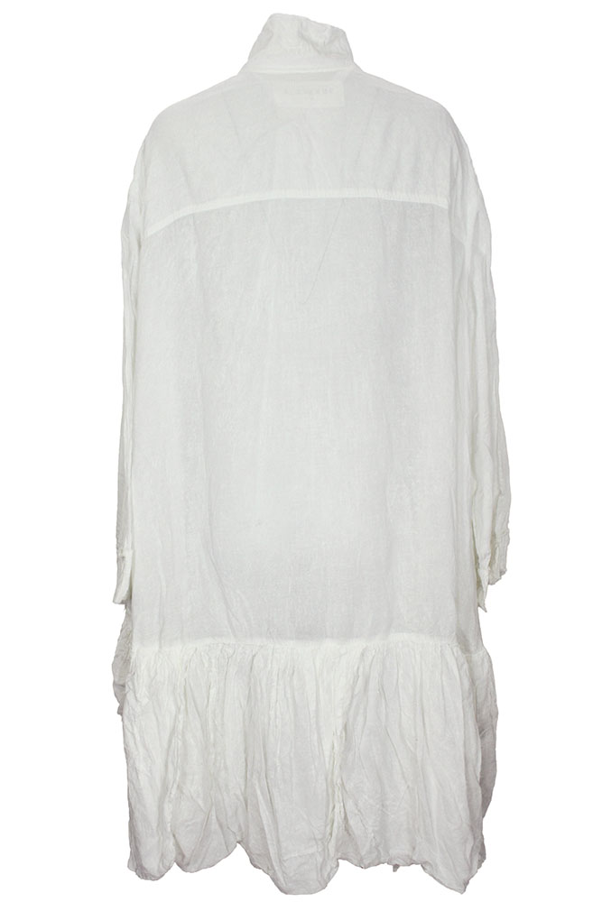 Rundholz Dip Collection over-sized dress seafoam fog colour (off-white), 100% cotton. Double layered small collar with raw edging. 6 button fastening to the drop waist, layered placket. Layered cuffs with raw edging. The skirt section is, overlaying double layered, rounded panels, high gathered where it joins the upper section. Longer at the rear, with a beautiful graduating curve. The size will fit a number of sizes, s,m,l, due to the oversized design