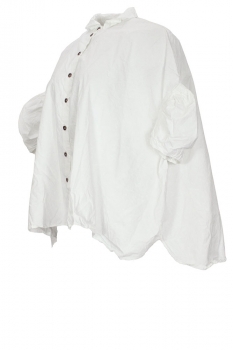 Rundholz Dip Collection Puff-Shouldered, sleeveless Blouse in seafoam fog colour (off-white), 100% cotton. Small double layered collar. 8 metal buttons down the front, buttons are distressed copper. 'A' Shaped, so very full. Gathered at the shoulders, with finished armholes. Longer at the rear with an elegant curving hem. Box pleated at rear centre. A lovely Summer blouse.