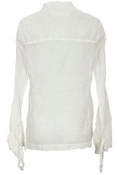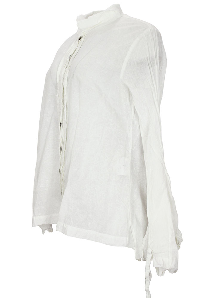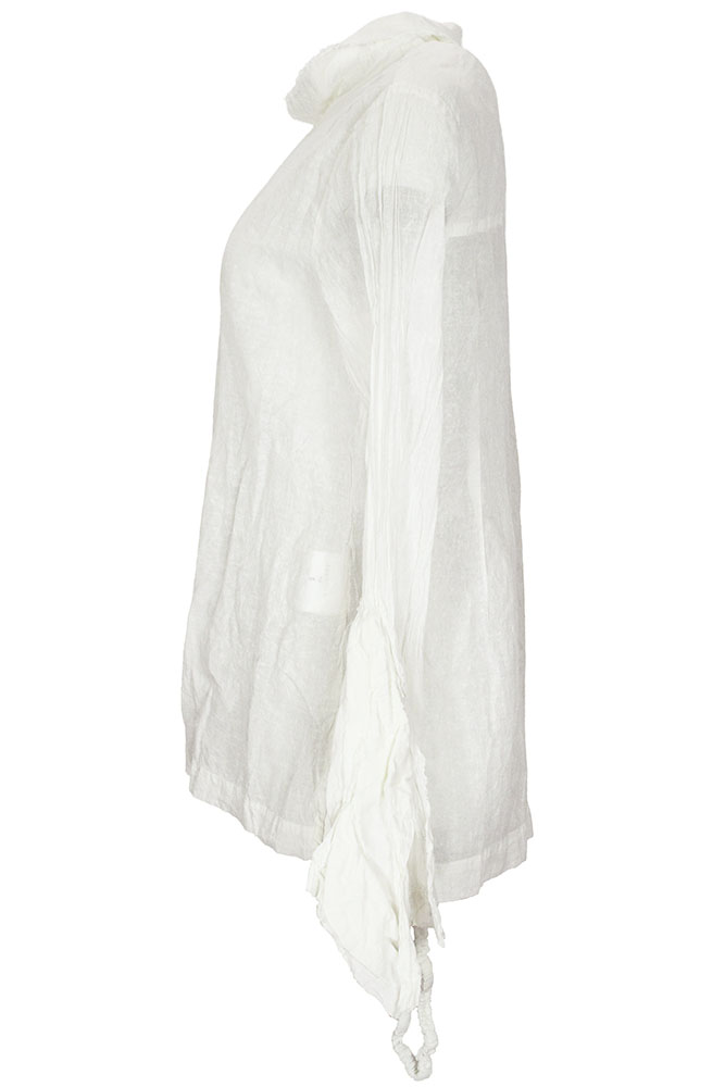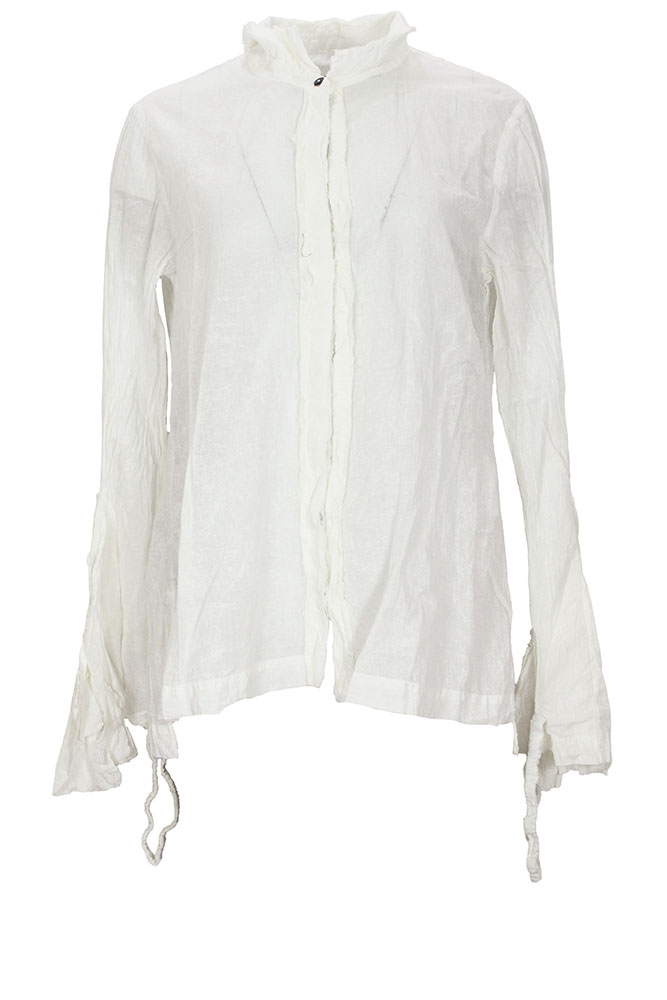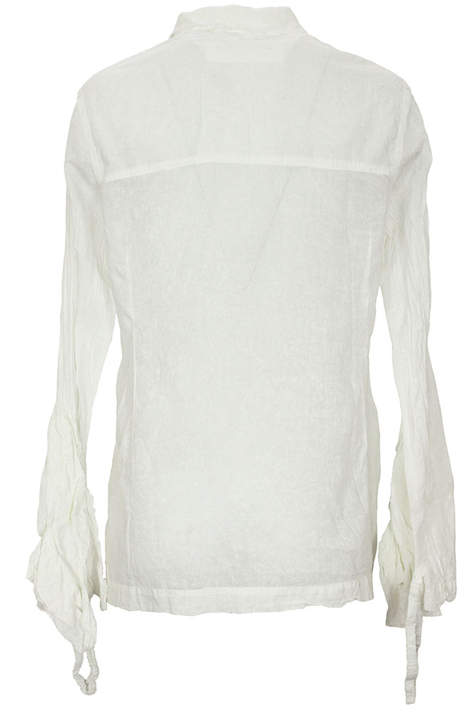 Rundholz Dip Collection long sleeved Blouse in seafoam fog colour (off-white), 100% cotton. Small double layered collar, with raw edging. 9 buttons down the front, with layered, raw edged placket. Crush pleated sleeves, with very elaborate cuffs. The cuffs are extra long, flaring, with fabric layer details, partially finished and partly raw edged and a gathered, elasticated ring to draw in the cuffs if required.