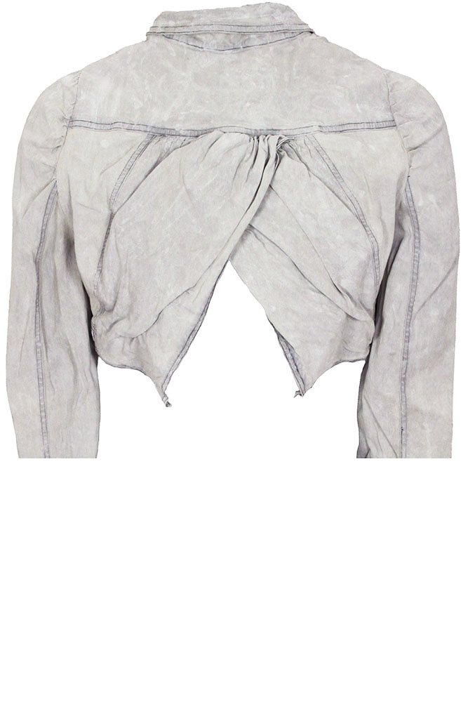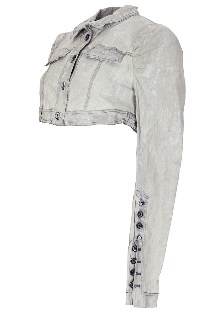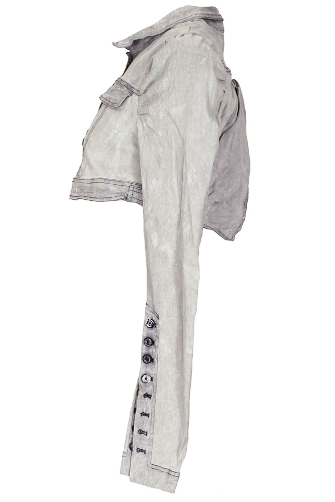 Rundholz Dip Collection short, long sleeved, distressed jacket in seafoam fog colour (off-white) Small double layered collar, with finished edging. 4 distressed buttons down the front, with reinforcing buttons inside. 2 small chest pockets with flaps. 'A' Shaped. Hem with fabric tabs and buttons adjustments. Sleeves are gathered where they join the main garment. Very long buttoned cuffs, with 8 buttons on each cuff. Cross-over and gathered, double layered rear panels, seating a wide and long vent.