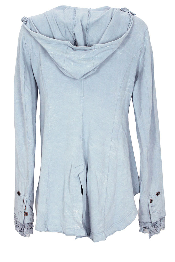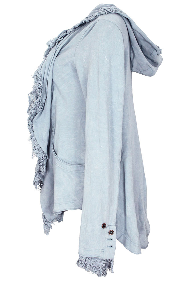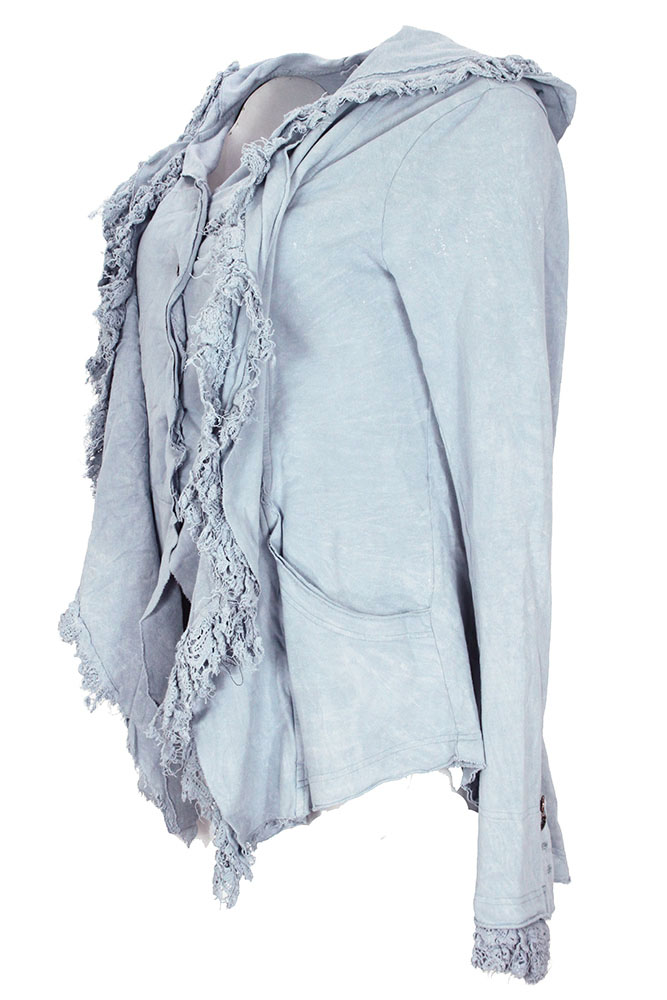 Rundholz Dip Collection distressed, hooded jacket in sky fog colour. Hood with rolled trim and lace extending into the lower parts. Layered panels down each side with lace and raw edged finish. 5 button fastening, waistcoat style. 2 curved pockets with double layered, raw edged trim. Longer at the rear, with a curved raw edged hem and long central vent. 4 buttons on the cuffs, double layered, raw edged trim and lace detail extending from the inside. A wonderful; jacket in a beautiful, distressed, stretch fabric.