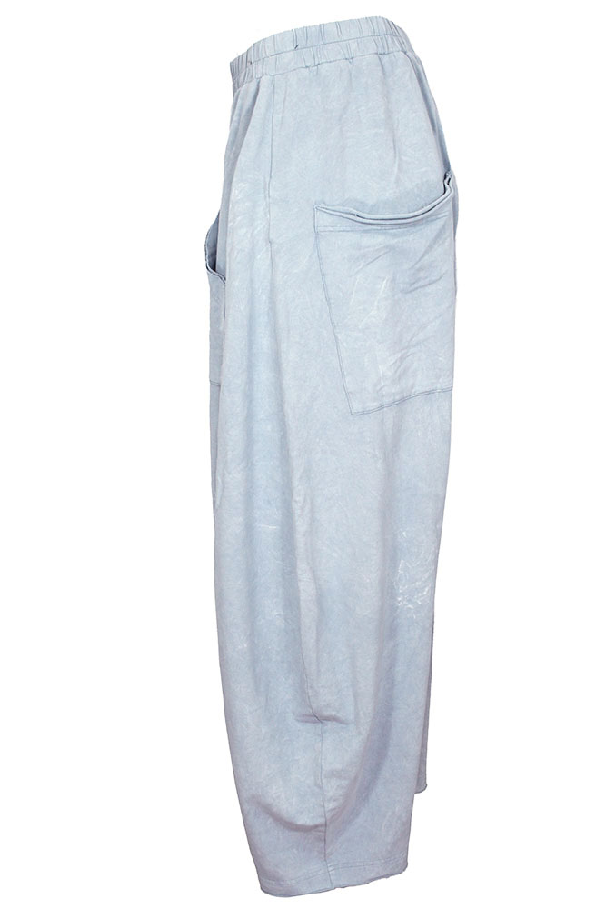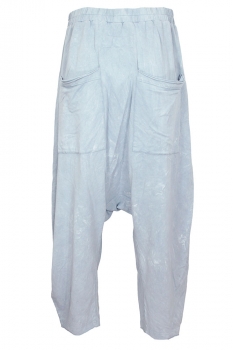 Rundholz Dip Collection distressed, wide stretch trousers in sky fog colour. Gathered elasticated waistband with lace on the rear inside. Kangaroo style pocket, with raw edged trim. 2 patch pockets at the rear, with double layer, rolled raw edged trim. Low drop crotch. Double layered and rolled, raw edged hems. Matching the jackets in the same colour way.