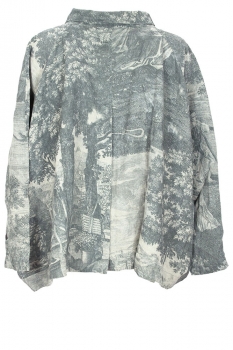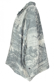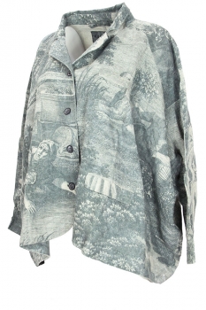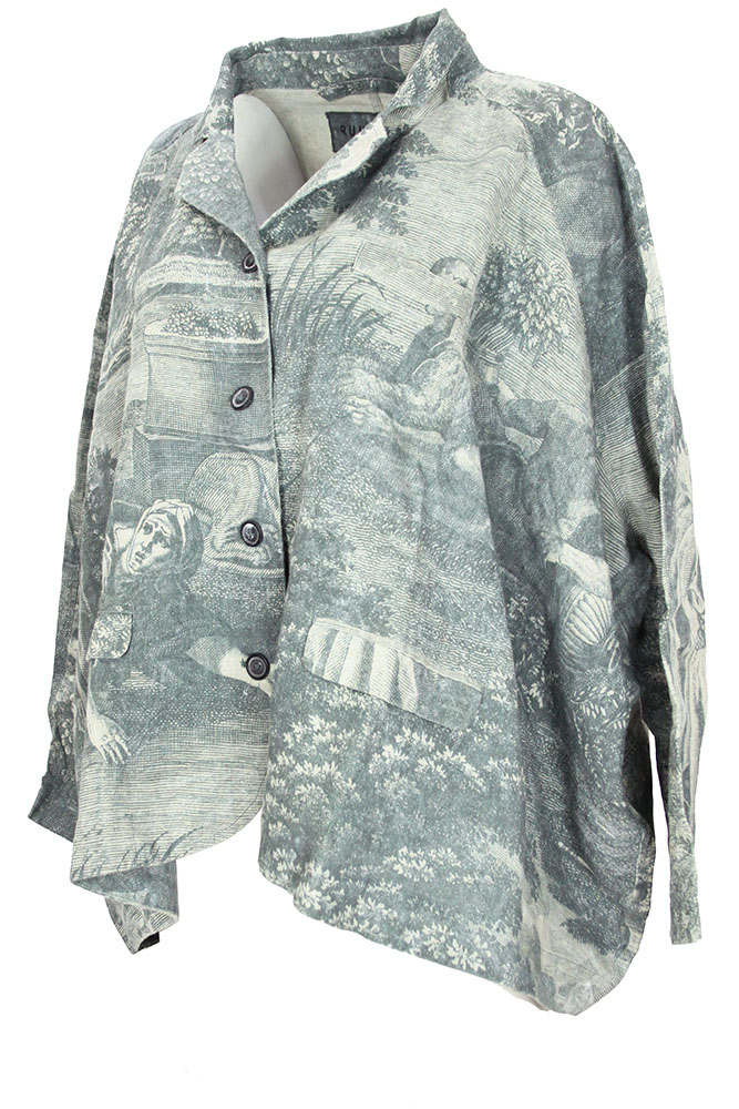 Rundholz Dip Collection extra-wide, oversized print fabric jacket in seaweed print. 4 button fastening. the Jacket can be worn as a round neck or notched lapel jacket. Left-side chest pocket. 2 main pockets with flaps and finishing trim. 4 button working cuffs. Very long central vent at the rear, with 6 button fastening, allowing the length of the vent to be changed. The jacket is extremely wide, allowing for a beautiful drape and fitting various sizes. Cut-awy style with curving hem longer at the rear. Very elegant and stylish. A stunning jacket in a gorgeous linen fabric.