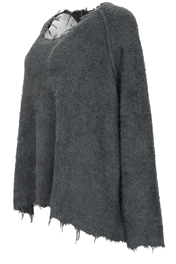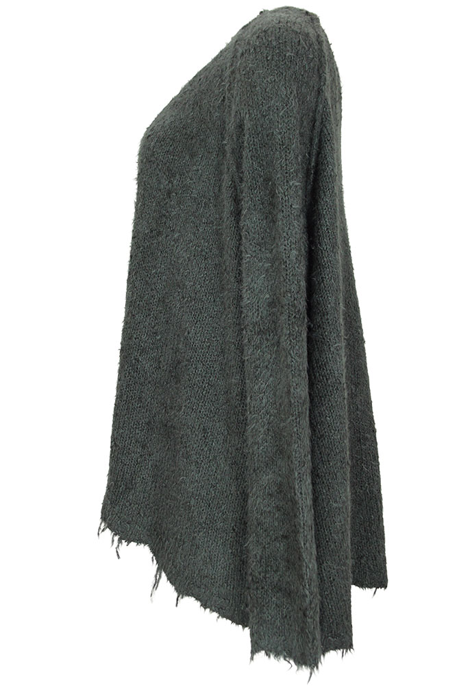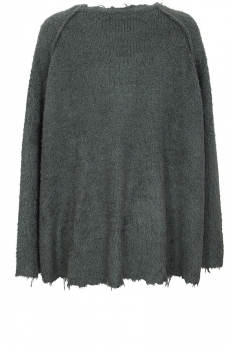 Rundholz Dip Collection wide bodied, knitted pullover in 100% silk, in seaweed colour. Wide neck with fringing. Long sleeved with fringed cuffs. Fringed hem, longer at the rear with a beautiful curving hem. A gorgeous piece of clothing, super soft. Will fit a few sizes.