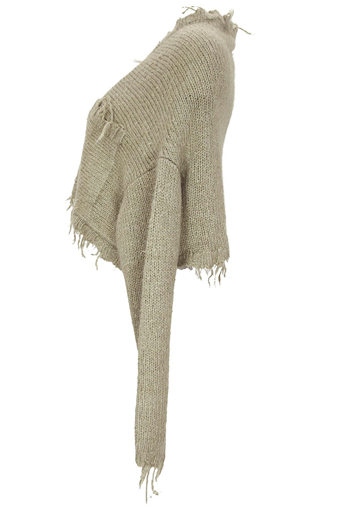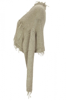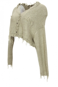 Rundholz Dip Collection short, wide bodied, knitted cardigan in 100% silk, in linen colour. 'V' neck with fringing and 3 button fastening. Long sleeved with fringed cuffs. Fringed, ribbed hem panel. 2 angled patch pockets with fringing. Another gorgeous piece of clothing, super soft. Will fit a few sizes.