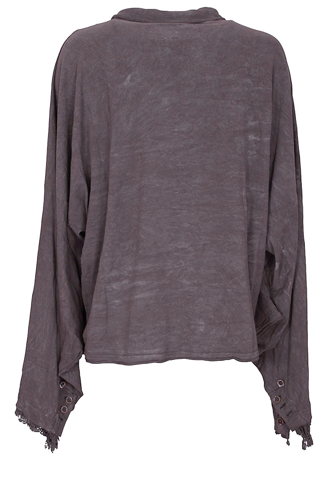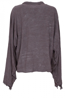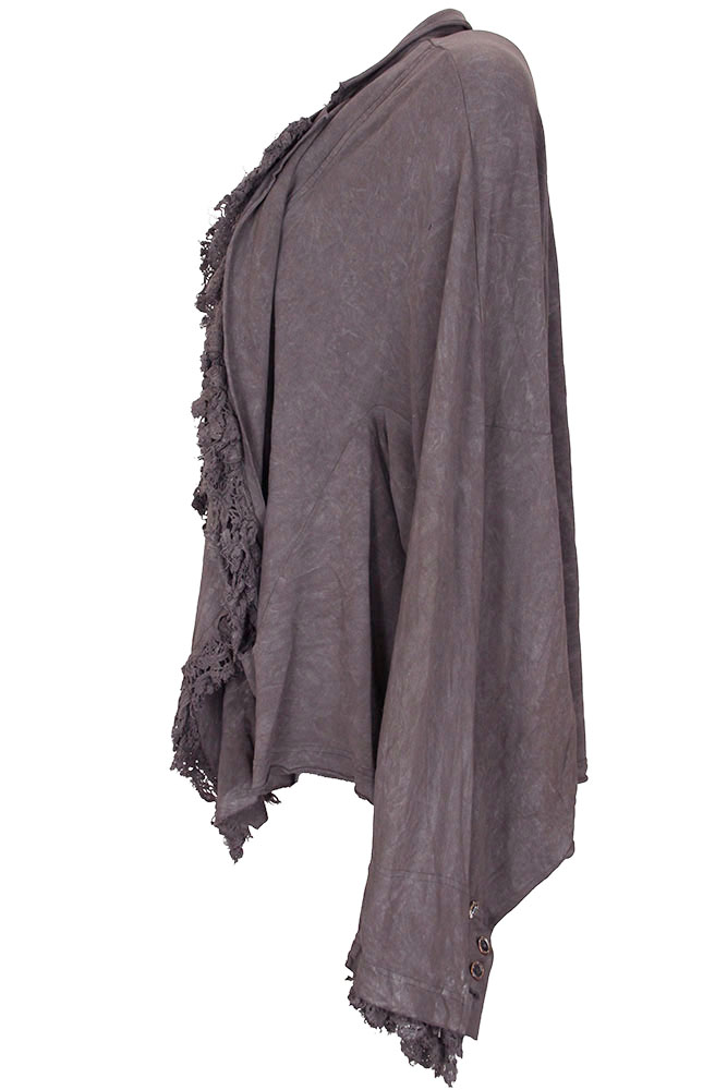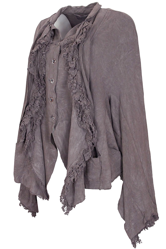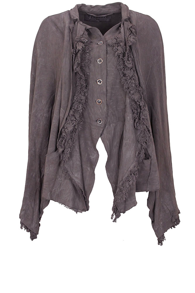 Rundholz Dip Collection distressed, jacket in amber fog colour. Layered panels down each side with lace and raw edged finish. 5 button fastening, waistcoat style. 2 curved pockets with double layered, raw edged trim. Longer at the rear, with a curved raw edged hem and long central vent. 4 buttons on the cuffs, double layered, raw edged trim and lace detail extending from the inside. A wonderful jacket in a beautiful, distressed, stretch fabric.