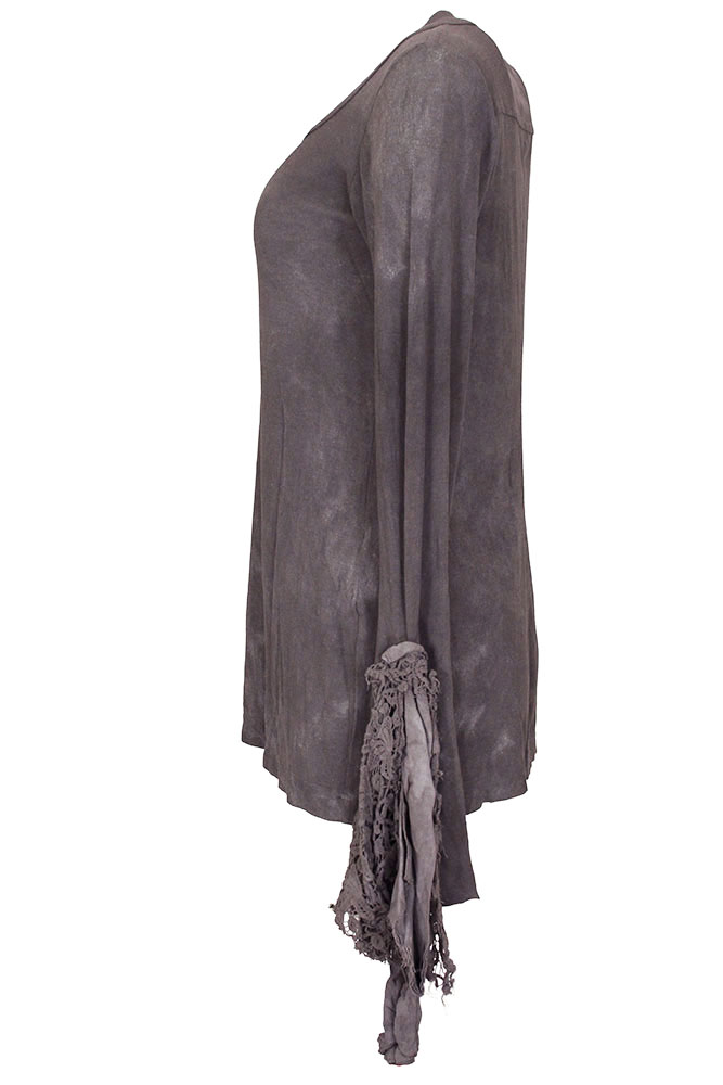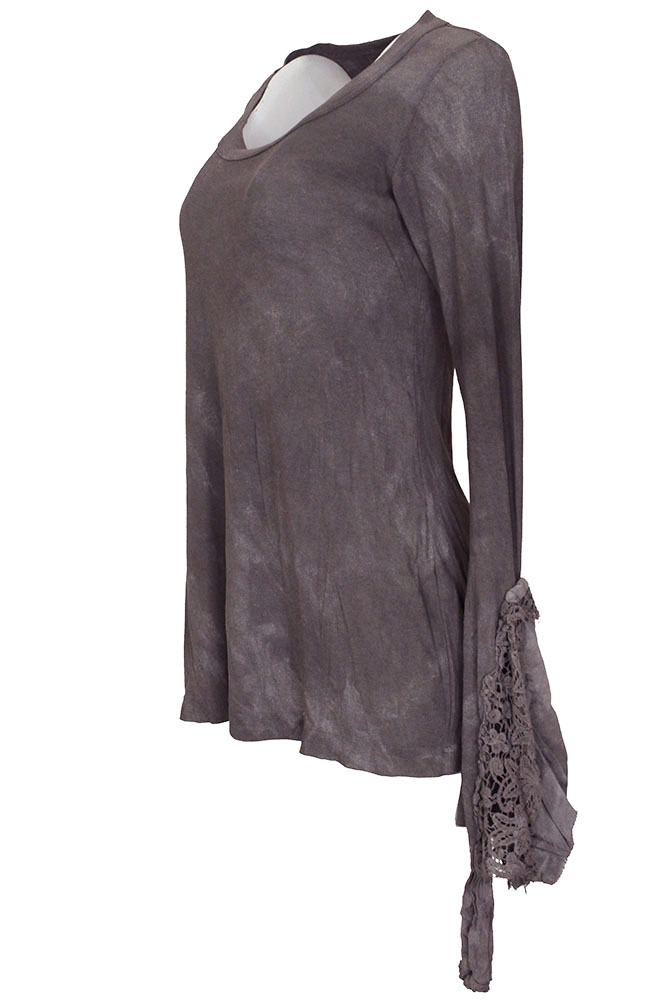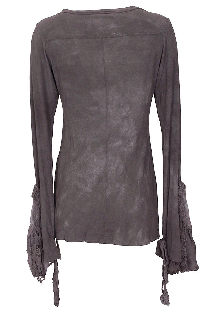 Rundholz Dip Collection long, stretch, ribbed, distressed jersey t-shirt in amber fog colour. Round collar with finished trim. Finished hem. Long sleeves with lace and cotton inserts, flaring out and with elasticated tie. Beautiful piece.