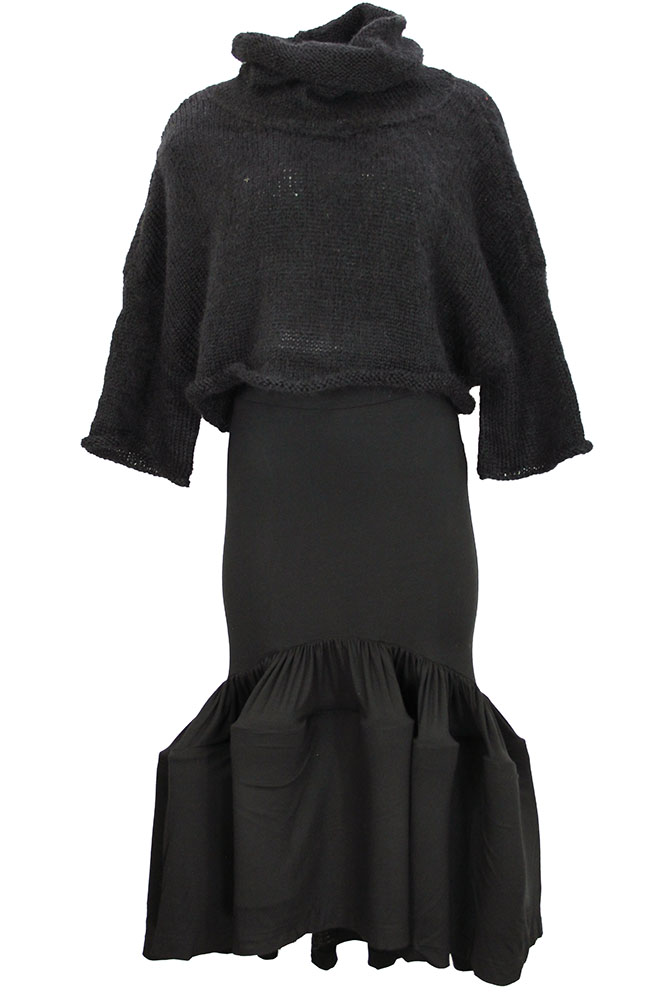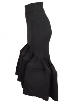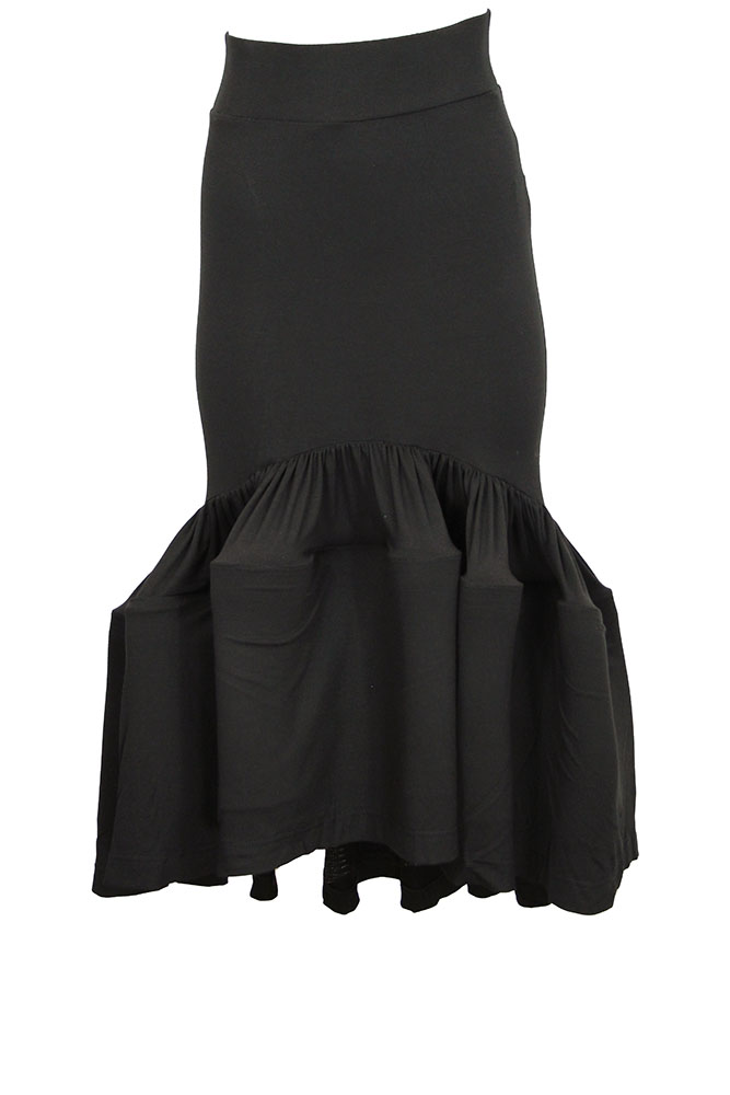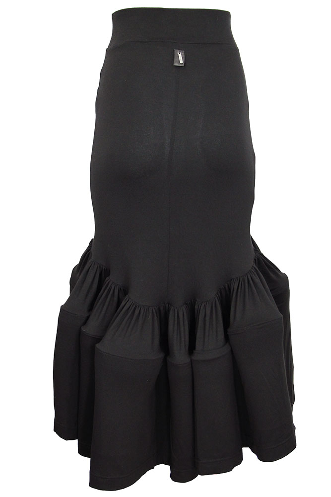 David's Road black skirt with elaborate ruffles at the base in black jersey. Double layered waistband, pull on style. Elaborate ruffles and longer at the rear. A beautifully shaped skirt.